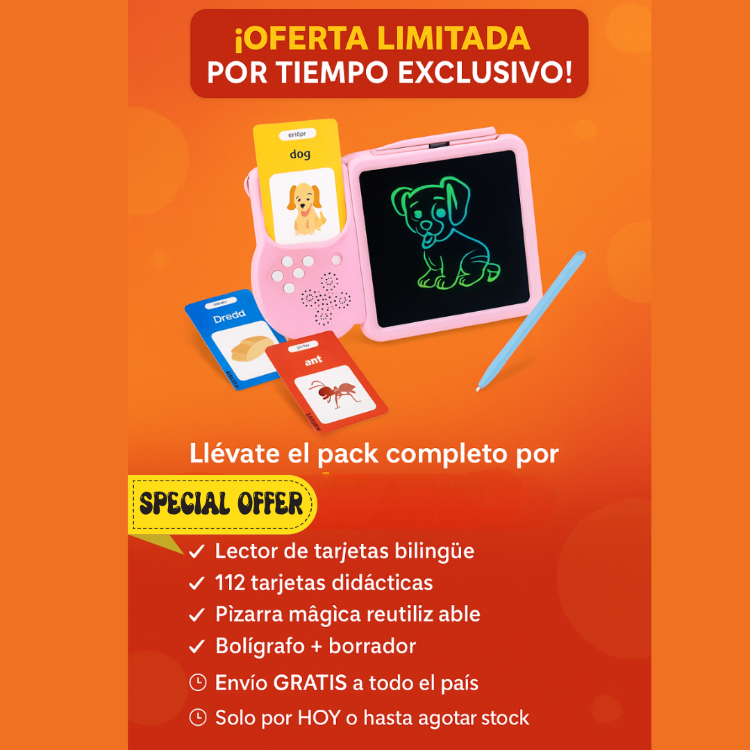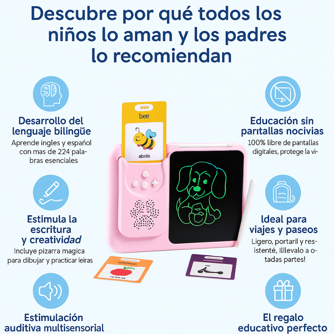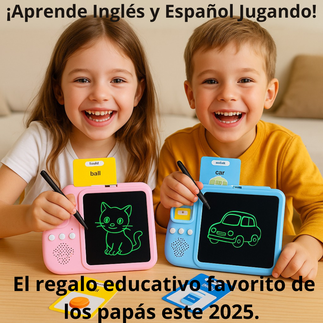El Lector de Tarjetas Inglés + Tablero 2 en 1 es una herramienta educativa interactiva diseñada para niños de 2 a 8 años. Combina un lector de tarjetas bilingüe (inglés y español) con una pizarra LCD para dibujar y escribir. Incluye 112 tarjetas a doble cara que, al insertarse en el lector, pronuncian palabras con acento nativo, facilitando el aprendizaje de vocabulario en ambas lenguas. La pizarra LCD permite a los niños practicar la escritura y el dibujo, fomentando la creatividad y la motricidad fina